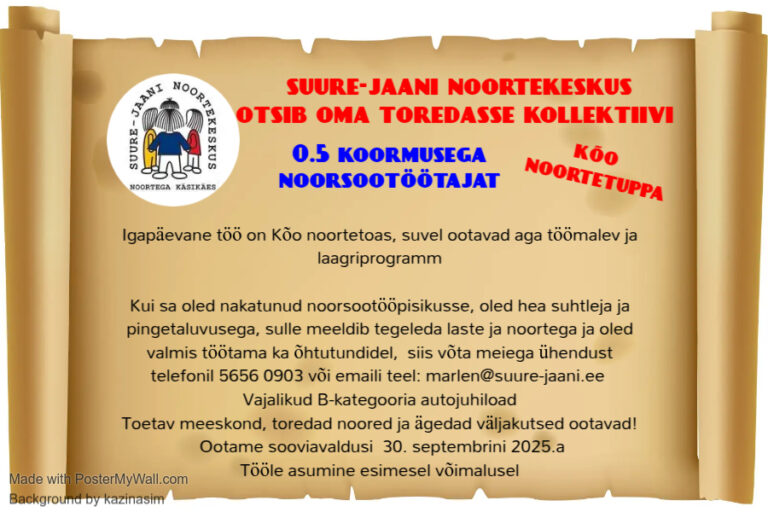 TÖÖKUULUTUS Otsime oma toredasse kollektiivi uut töötajat Kõo piirkonda 0,5 koormusega. Töökaaslased on toredad, lapsed…