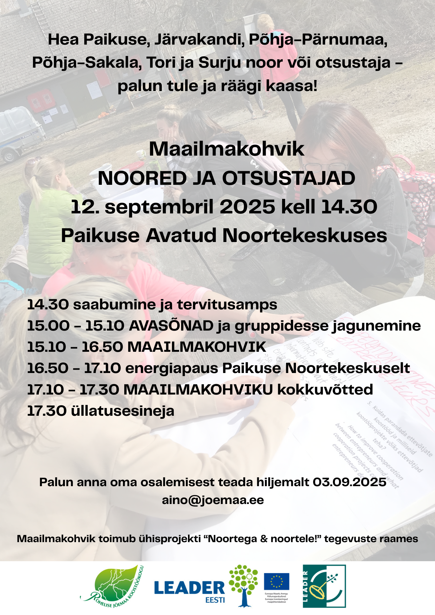 Reedel, 12. septembril algusega kell 14.30 toimub Paikuse noortekeskuses maailmakohvik NOORED JA OTSUSTAJAD. Maailmakohvikus osalevad noored Rohelise Jõemaa Koostöökogu erinevatest