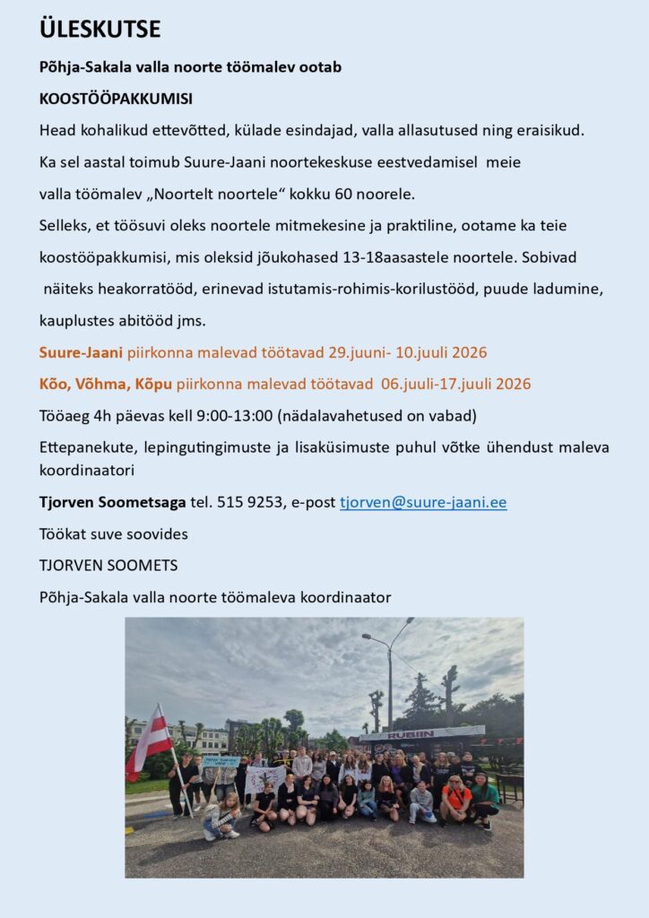 Ka sel aastal toimub Suure-Jaani noortekeskuse eestvedamisel meie valla töömalev „Noortelt noortele“ kokku 60 noorele.