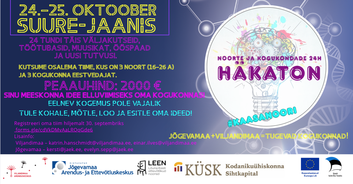 Ootame häkatonile meeskondi, kus on koos juba sündmusi korraldanud eestvedajad ja kohalikud noored, et ühe ööpäeva jooksul panna alus omavahelisele koostööle. Häkatonil sünnib üheskoos tegevusplaan ja lahenduskäik ühiselt korraldatavale sündmusele. Lisaks on välja pandud 𝟐𝟎𝟎𝟎 € 𝐯õ𝐢𝐝𝐮𝐫𝐚𝐡𝐚, mis on seemneks, et idee kogukonnas päriselt ellu viia!